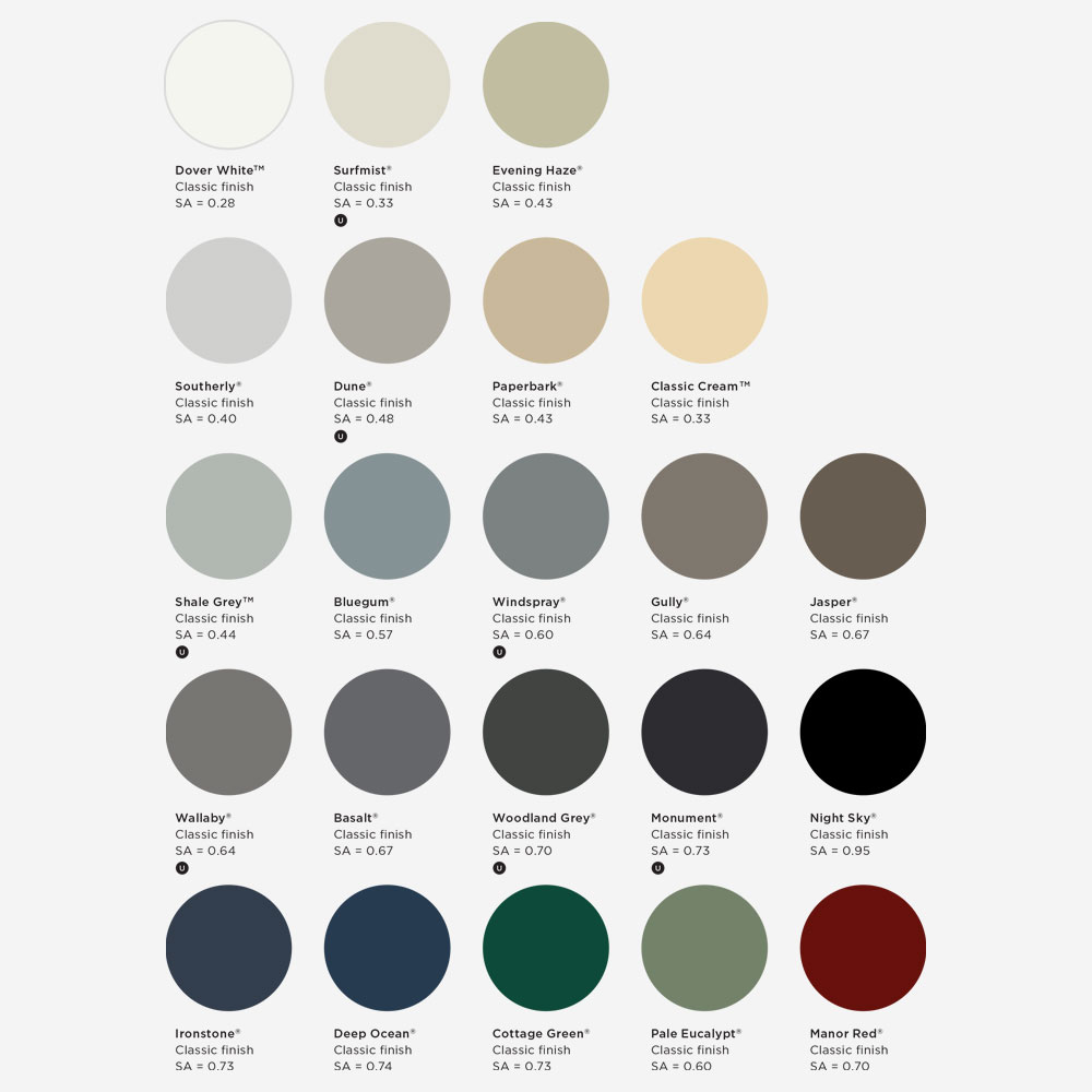 Choose from the full Colorbond® palette, Dulux custom colours, and a variety of finishes including gloss, satin, matte,
